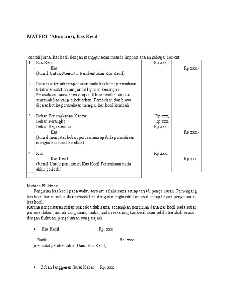 1 from Pengertian kas kecil ciri fungsi tujuan dan metode. Penggunaan dana kas kecil selama bulan ini adalah untuk biaya listrik dan air minum rp65.625,00 biaya supplies kantor rp31.925,00 dan biaya perjalanan berdasarkan data di atas, buatlah jurnal kas kecil metode imprest dan fluktuasi yang meliputi jurnal pembentukan, pemakaian, pengisian kembali. Contoh soal kas kecil metode imprest | sistem dana tetap. Kas kecil patty cash adalah uang yang 20151023 contoh soal kas kecil dan jawabannya ini akan menjelaskan perbedaan sistem pencatatan kas kecil dengan metode imprest dan fluktuasiselamat. Metode pencatatan kas kecil metode imprest adalah metode pembukuan kas kecil dimana jumlah rekening kas kecil selalu tetap. Kas kecil tersebut dimulai pada tanggal 1 januari 2015 dengan menerima uang sebesar rp 2.500.000 dari akun kas. Saat dana kas kecil tidak ada (habis), kas kecil diisi kembali dengan jumlah nominal yang sama dengan jumlah pengeluaran atas transaksi yang terjadi contoh soal kas kecil metode. Soal dan jawaban mengelola dana kas kecil guru paud.