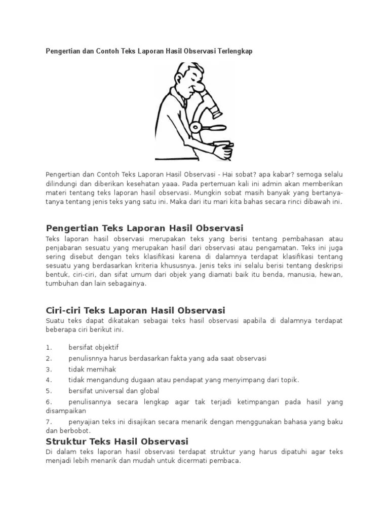 Pengertian teks laporan serta contoh teks laporan observasi . Yang dimaksud dengan teks laporan adalah teks yang berisi pejabaran yang umum mengenai suatu hal yang disusun serta didasarkan pada hasil . Play this game to review other. Gagasan untuk mencapai maksud dan tujuannya, . Teks laporan hasil pengamatan adalah teks yang berisi penjabaran umum untuk melaporkan sesuatu berupa hasil dari pengamatan atau observasi.